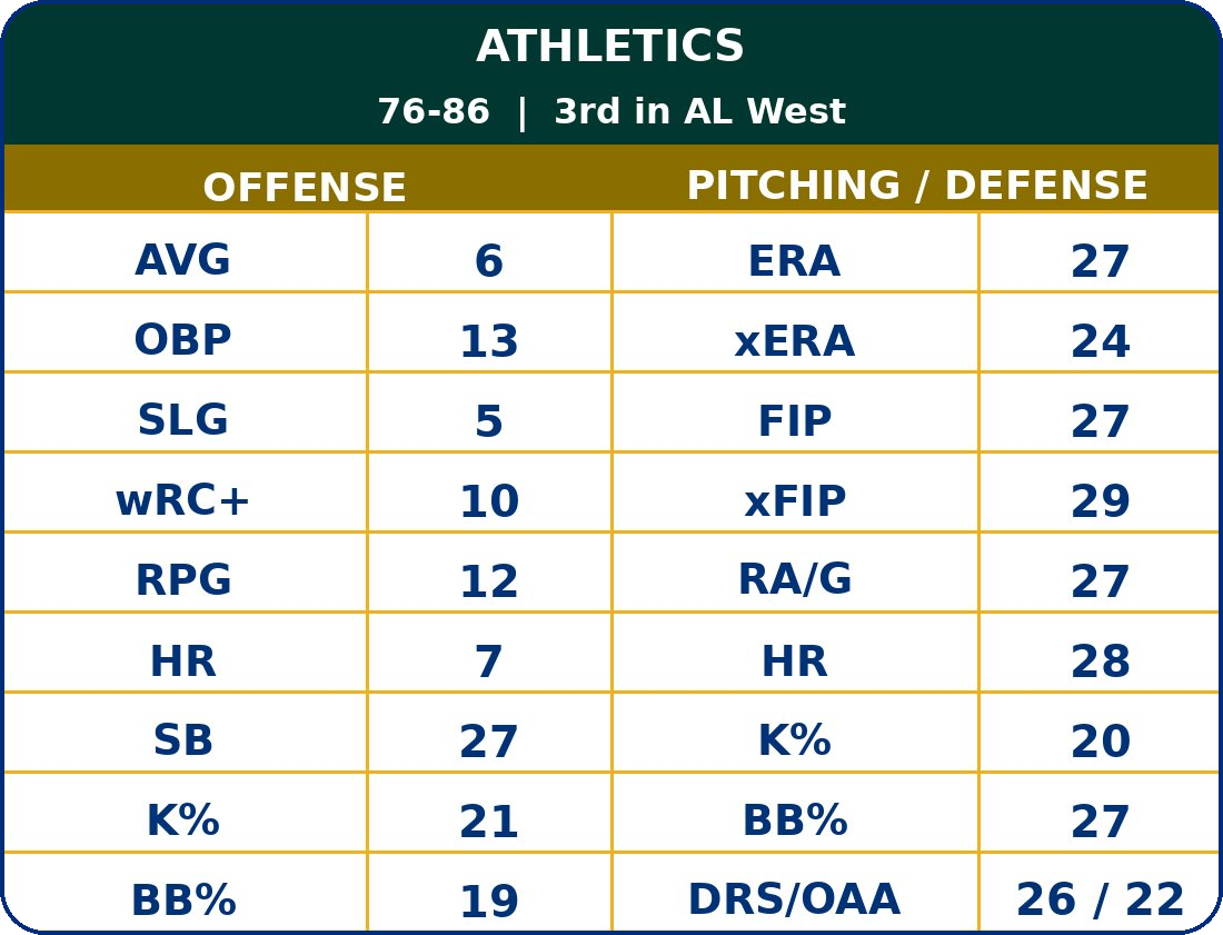 The Athletics are 255–393 over the past four season, including two 100-plus loss seasons. They last made the postseason 2018-20, and have qualified 11 times in the 2000s, but it’s mostly been grouped together and sandwiched around rebuilds.