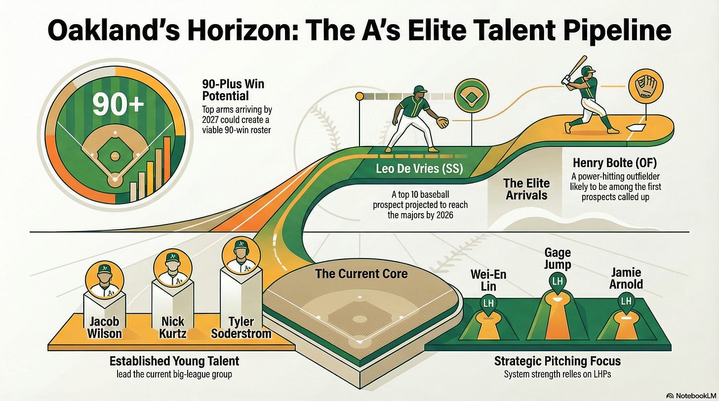 It’s not a good system, but they have impact at the top and a strong group of young talent in the big leagues already with Jacob Wilson, Nick Kurtz, and Tyler Soderstrom leading the way.